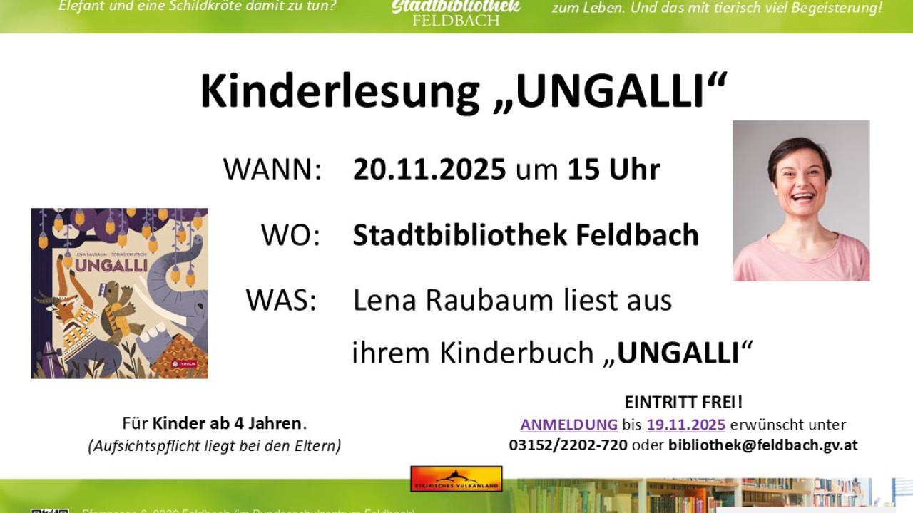 20.11.2025 Kinderlesung "UNGALLI" Lena Raubaum liest aus ihrem Kinderbuch "UNGALLI".Donnerstag, 20.11.2025 um 15 Uhr in der Stadtbibliothek Feldbach.Für Kinder ab 4 Jahre.Eintritt frei - Anmeldung in der Biblithek erwünscht!